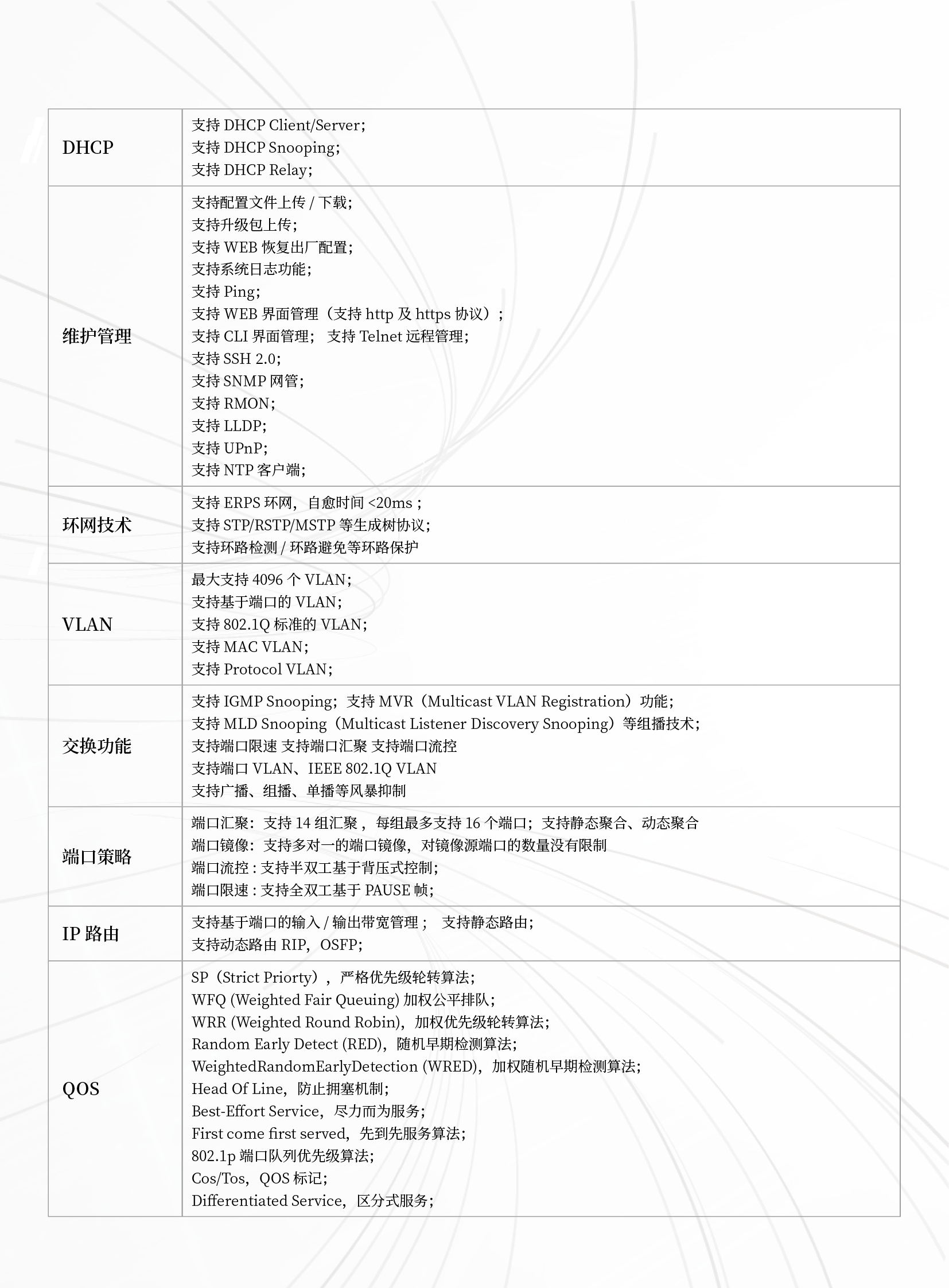 具有L2/L3/L4線速交換能力、具備QoS、帶寬控制、組播等高級(jí)功能,是定位于網(wǎng)絡(luò)核心層、實(shí)現(xiàn)整體網(wǎng)絡(luò)增值的優(yōu)選設(shè)備。同時(shí),提供基于硬件的流量分類和組播、速率限制和QoS機(jī)制,為用戶開展增值業(yè)務(wù)提供強(qiáng)大的支持。