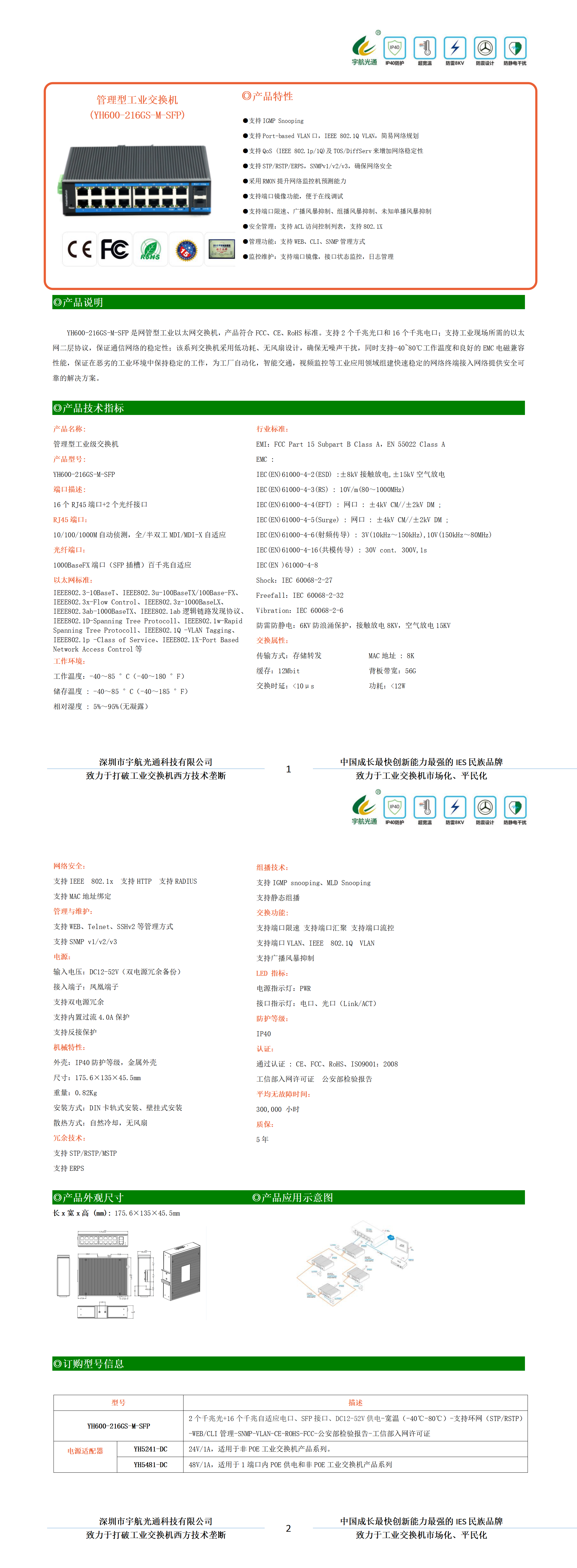 YH600-216GS-M-SFP是網管型工業以太網交換機,產品符合FCC、CE、RoHS標準。支持2個千兆光口和16個千兆電口;支持工業現場所需的以太網二層協議,保證通信網絡的穩定性;該系列交換機采用低功耗、無風扇設計,確保無噪聲干擾,同時支持-40~80℃工作溫度和良好的EMC電磁兼容性能,保證在惡劣的工業環境中保持穩定的工作,為工廠自動化,智能交通,視頻監控等工業應用領域組建快速穩定的網絡終端接入網絡提供安全可靠的解決方案。