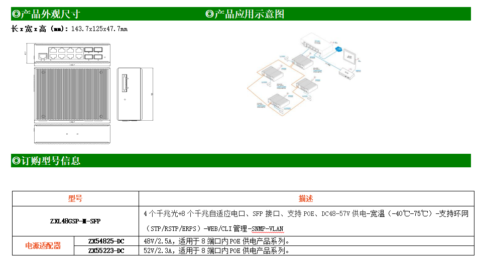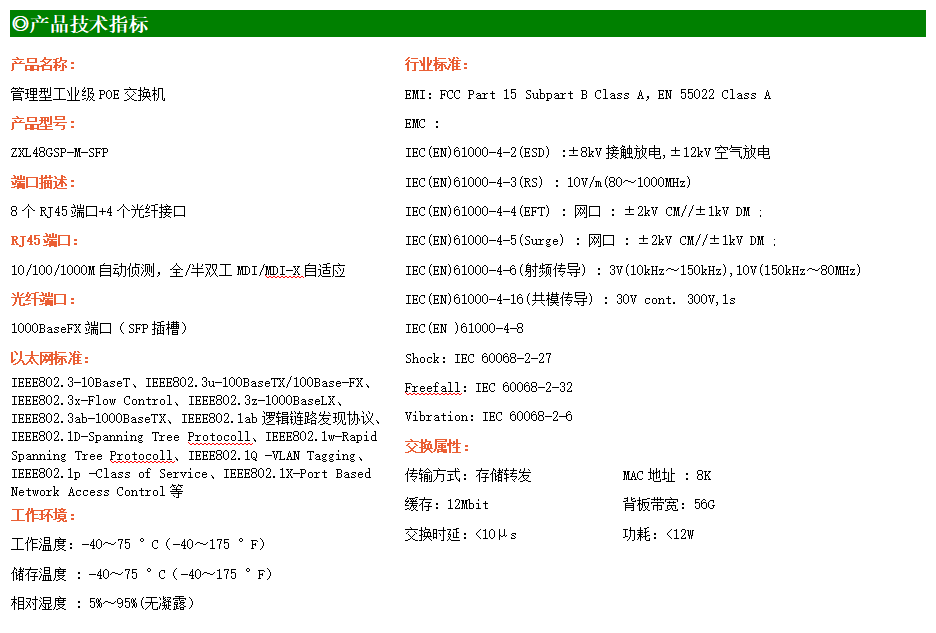 ZXL48GSP-M-SFP是網(wǎng)管型工業(yè)以太網(wǎng)POE交換機(jī),產(chǎn)品符合FCC、CE、RoHS標(biāo)準(zhǔn)。支持4個(gè)千兆光口和8個(gè)千兆電口;支持工業(yè)現(xiàn)場(chǎng)所需的以太網(wǎng)二層協(xié)議,保證通信網(wǎng)絡(luò)的穩(wěn)定性;該系列交換機(jī)采用低功耗、無(wú)風(fēng)扇設(shè)計(jì),確保無(wú)噪聲干擾,同時(shí)支持-40~75℃工作溫度和良好的EMC電磁兼容性能,保證在惡劣的工業(yè)環(huán)境中保持穩(wěn)定的工作,為工廠自動(dòng)化,智能交通,視頻監(jiān)控等工業(yè)應(yīng)用領(lǐng)域組建快速穩(wěn)定的網(wǎng)絡(luò)終端接入網(wǎng)絡(luò)提供安全可靠的解決方案。