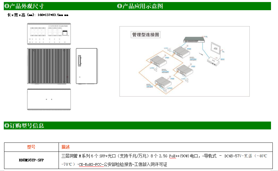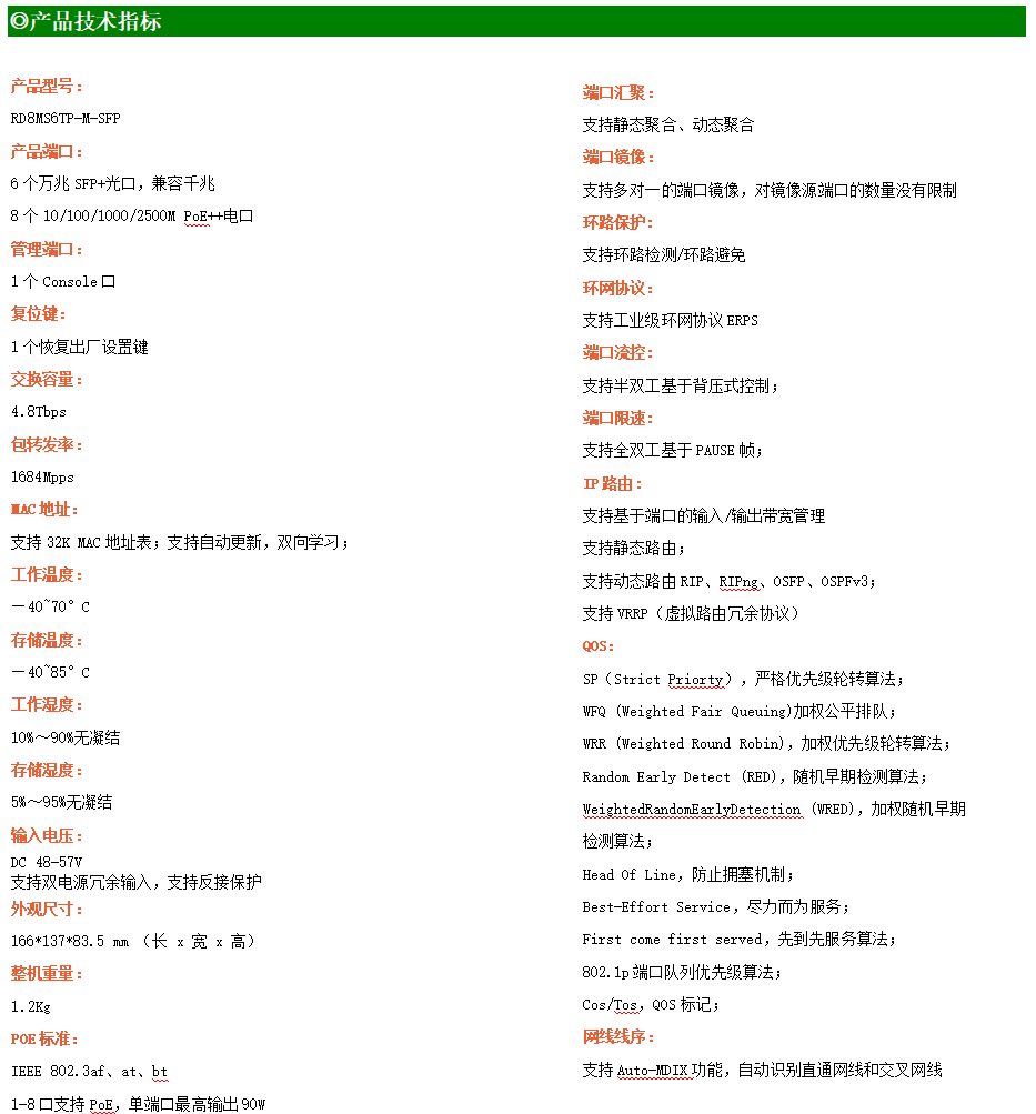 RD8MS6TP-SFP交換機是我司推出的一款萬兆三層工業(yè)以太網(wǎng)交換機,產(chǎn)品符合FCC、CE、RoHS標準。可提供8個2.5G PoE端口,所有PoE端口符合IEEE802.3af/at/bt標準。具備先進的硬件處理能力和最豐富的業(yè)務特性。支持IPv4/IPv6 硬件雙棧及線速轉發(fā),使客戶能夠從容應對即將帶來的IPv6 時代其提供高容量的交換能力。RD8MS6TP-SFP交換機具有-40℃~70℃的工作溫度,具有超強的堅固度能適應各種嚴苛環(huán)境。導軌式安裝特性、寬溫操作,使RD8MS6TP-SFP的交換機成為一個即插即用的工業(yè)級設備,為用戶的以太網(wǎng)設備聯(lián)網(wǎng)提供可靠、便捷的解決方案。