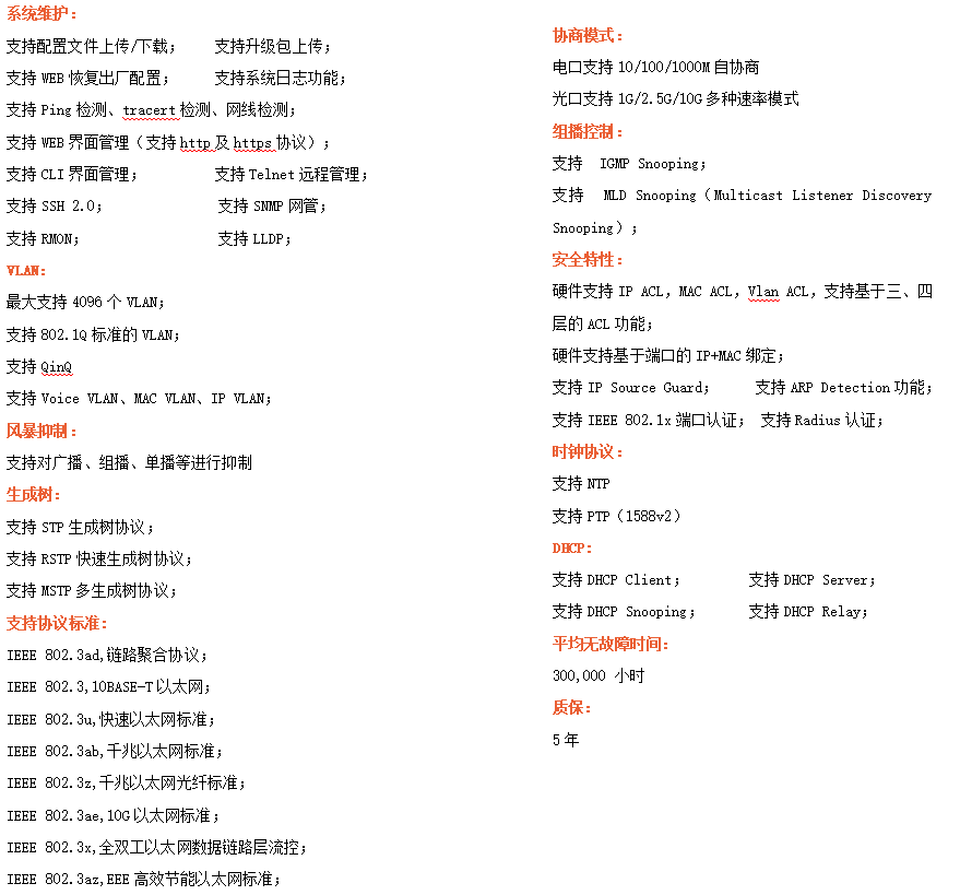 ●網絡冗余:支持STP/RSTP/MSTP,支持ERPS(自愈時間<20ms)