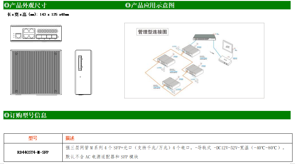 RD44GST4-M-SFP交換機是我司推出的一款萬兆三層交換機,配備4個SFP+光口和4個10/100/1000M Base-T自適應電口,具備先進的硬件處理能力和最豐富的業務特性。支持IPv4/IPv6 硬件雙棧及線速轉發,使客戶能夠從容應對即將帶來的IPv6 時代其提供高容量的交換能力。RD44GST4-M-SFP交換機具有-40℃~80℃的工作溫度,具有超強的堅固度能適應各種嚴苛環境。導軌式安裝特性、寬溫操作,使RD44GST4-M-SFP的交換機成為一個即插即用的工業級設備,為用戶的以太網設備聯網提供可靠、便捷的解決方案。