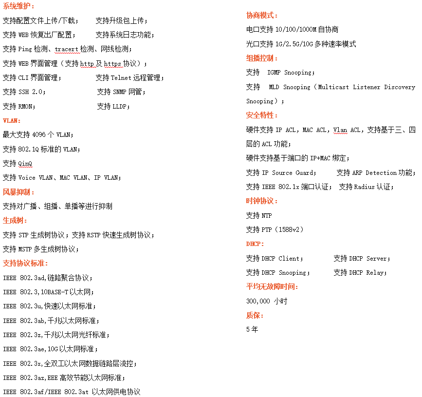 ●網絡冗余:支持STP/RSTP/MSTP,支持ERPS(自愈時間<20ms)