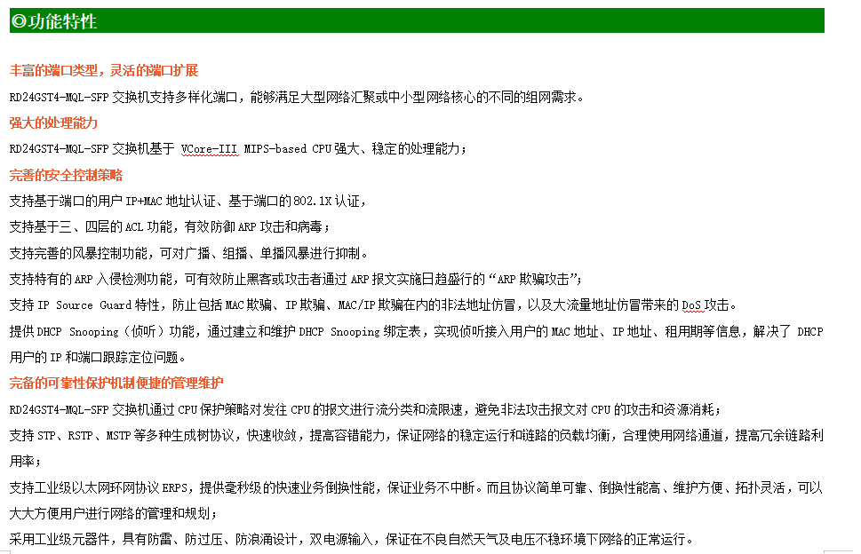 ●網絡冗余:支持STP/RSTP/MSTP,支持ERPS(自愈時間<20ms)