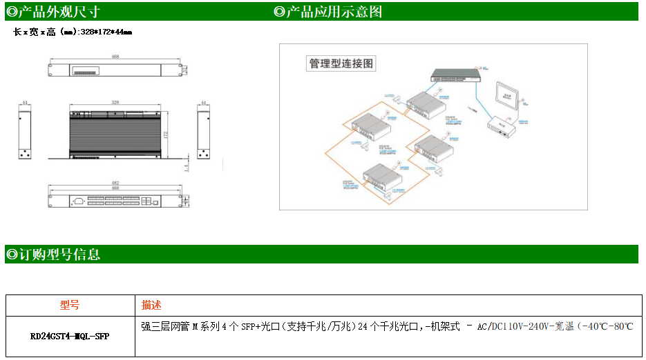 RD24GST4-MQL-SFP交換機是我司推出的一款萬兆三層交換機,配備4個萬兆SFP+光口和24個千兆光口,具備先進的硬件處理能力和最豐富的業務特性。支持IPv4/IPv6 硬件雙棧及線速轉發,使客戶能夠從容應對即將帶來的IPv6 時代其提供高容量的交換能力。RD24GST4-MQL-SFP交換機具有-40℃~80℃的工作溫度,具有超強的堅固度能適應各種嚴苛環境。導軌式安裝特性、寬溫操作,使RD24GST4-MQL-SFP的交換機成為一個即插即用的工業級設備,為用戶的以太網設備聯網提供可靠、便捷的解決方案。