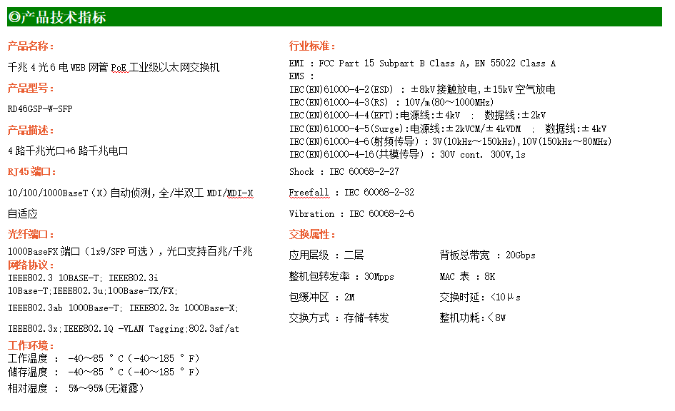 RD46GSP-W-SFP系列WEB網(wǎng)管工業(yè)級以太網(wǎng)交換機,產(chǎn)品符合FCC、CE、ROHS標(biāo)準(zhǔn),支持工業(yè)現(xiàn)場所需的以太網(wǎng)二層協(xié)議,保證通信網(wǎng)絡(luò)的穩(wěn)定性。該系列交換機采用低功耗、無風(fēng)扇設(shè)計,確保無噪聲干擾,同時支持-40~85℃工作溫度和良好的EMC電磁兼容性能,保證在惡劣的工業(yè)環(huán)境中保持穩(wěn)定的工作,為工廠自動化,智能交通,視頻監(jiān)控等工業(yè)應(yīng)用領(lǐng)域組建快速穩(wěn)定的網(wǎng)絡(luò)終端接入網(wǎng)絡(luò)提供安全可靠的解決方案。