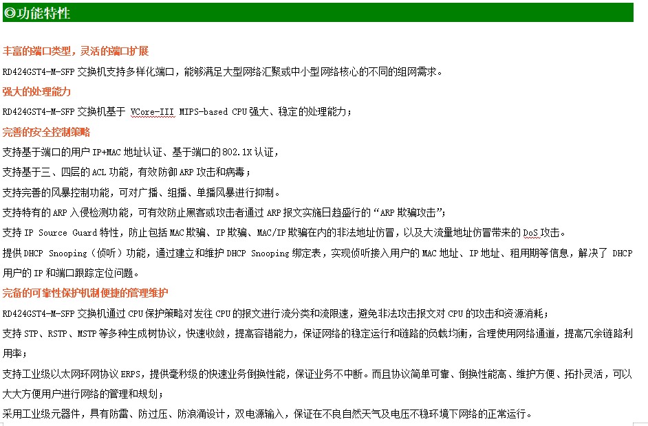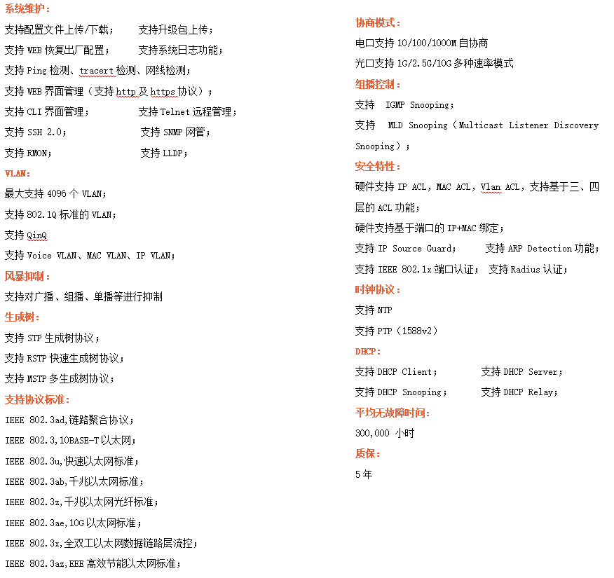 ●網絡冗余:支持STP/RSTP/MSTP,支持ERPS(自愈時間<20ms)