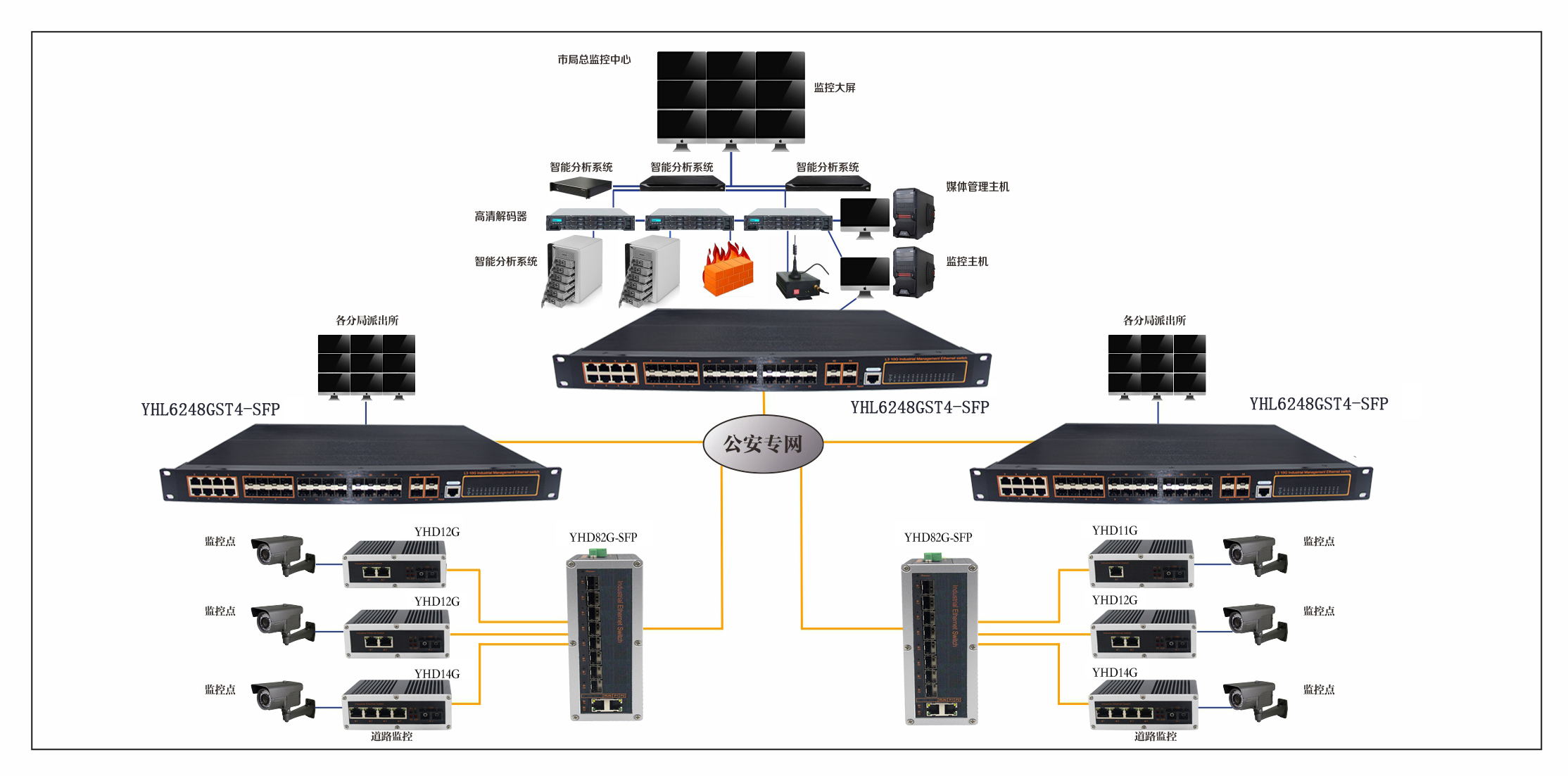 宇航在解決方案中采用YHL6248GST4-SFP, YHD28G, YHD14G,YHD12G,根據各個城市安防監控點,安裝定點攝像機,快球,解碼器,報警探頭等設備,通過光纖將視音信號匯聚到派出所光纖匯聚點,將數字視頻傳送到遠程分局監控中心,  保障各個監控點監控到位,提高網絡數據傳輸高效性。