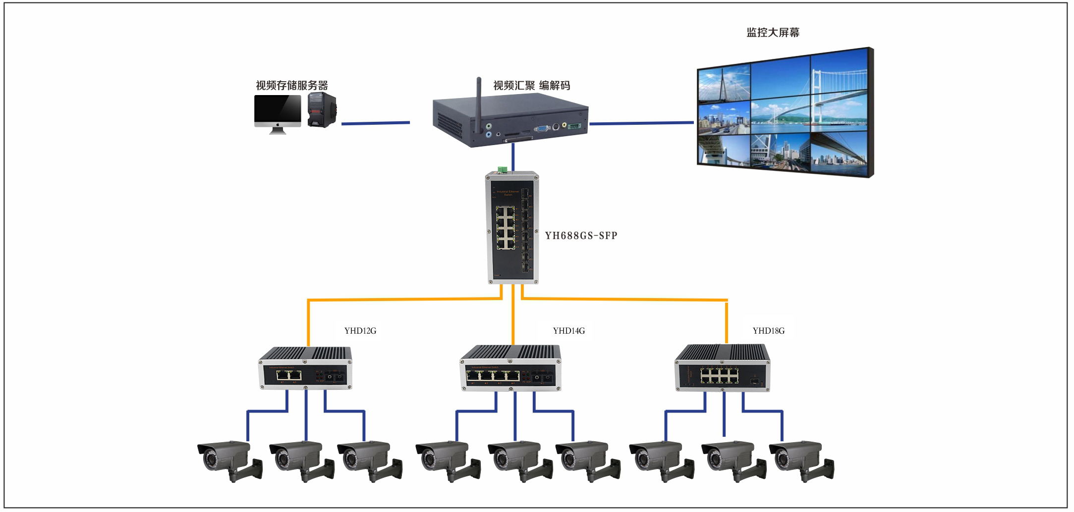 宇航在自動化報警系統解決方案采用了YH688GS-SFP, YHD18G, YHD14G, YHD12G, 工業以太網交換機進行轉發,現場變電站在監控與存儲視頻信息的同時,交換機將各個變電站的視頻信息上傳到電力局中心千兆骨干網監控中心。實現監控中心遠程監控下級變電站的遠程圖像,進而綜合實現視頻監控及聯動報警的功能。
