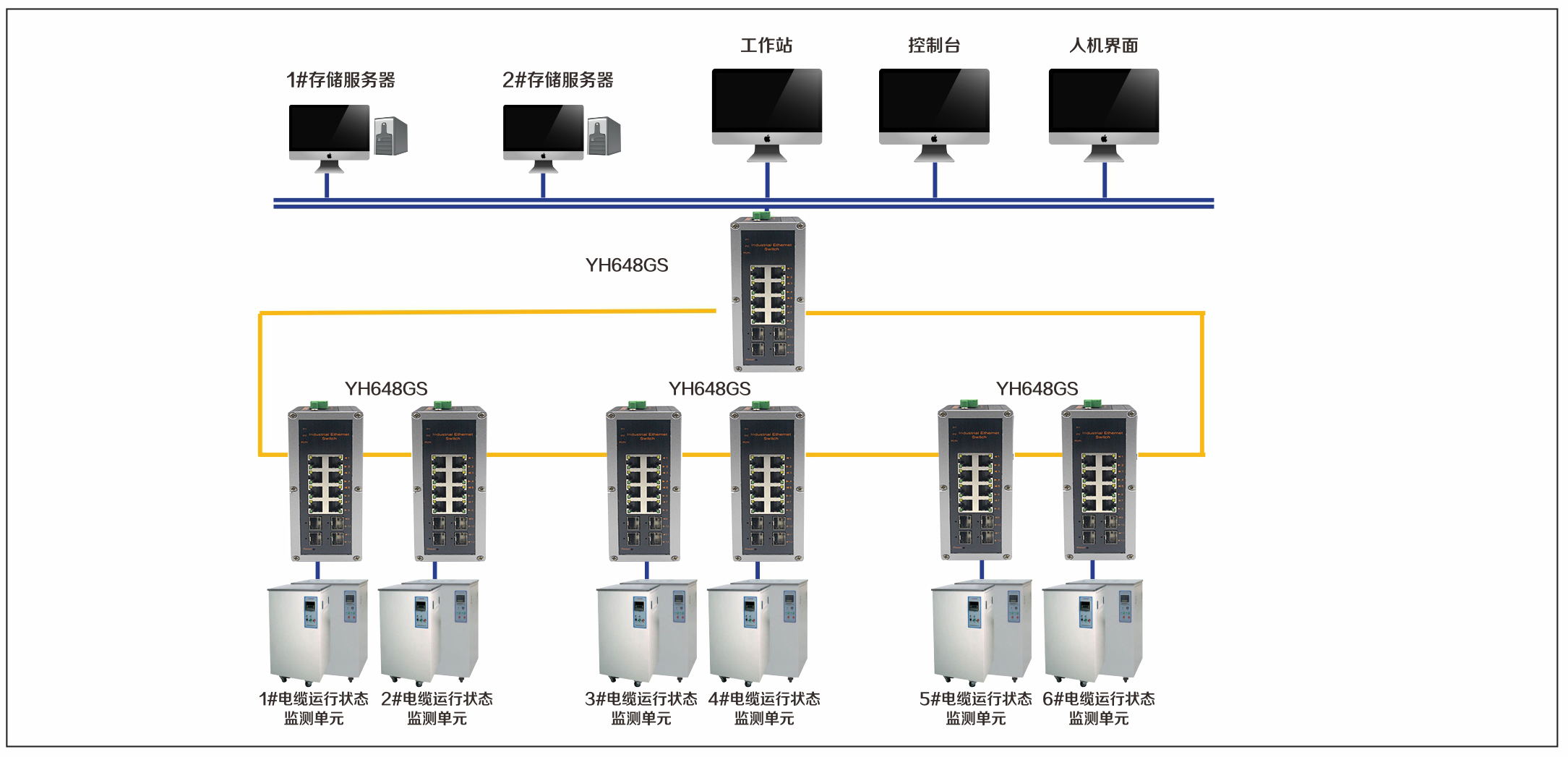 宇航在輸電網高壓電纜解決方案中采用了YH648GS工業交換機,在整個系統的各監測點使用一臺以太網交換機將監測點的各種監測信號通過光纖環網匯聚至中心監控站。