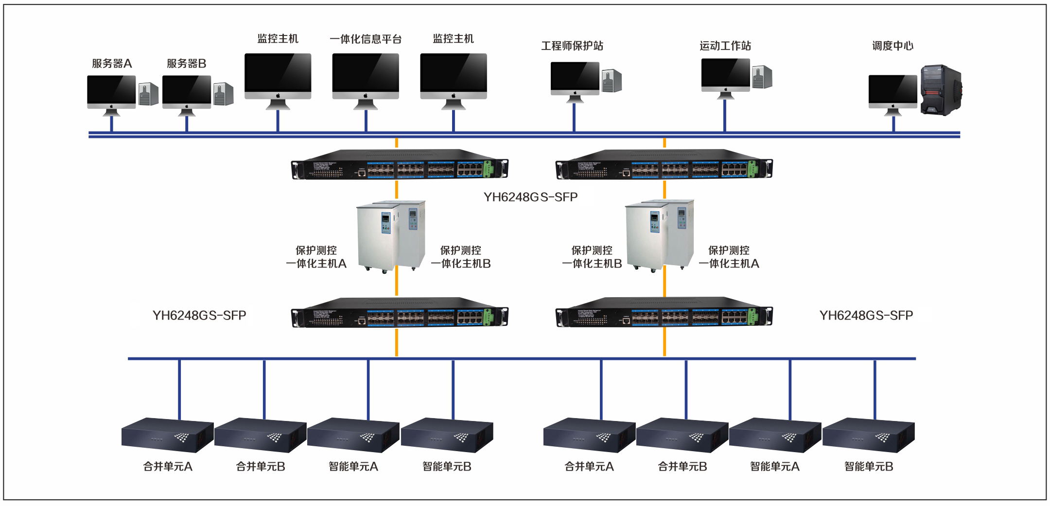 宇航在智能變電站監控系統解決方案中采用了YH6248G4TS-SFP.監控A,B雙網的,站控層和系統層倆層一網模式,全站一網到底,改變母差直采直跳模式采用網采網跳。 監控A,B雙網很好的保證了數據采集的穩定性和冗余性。智能IED設備保護單元,合 并單元直接與交換機或保護監控設備直接連接,然后通過A,B網上傳站控層,連接各服務器,監控主機,運動工作站以及遠方控制中心,實現全站信息一體化和遠程操控。