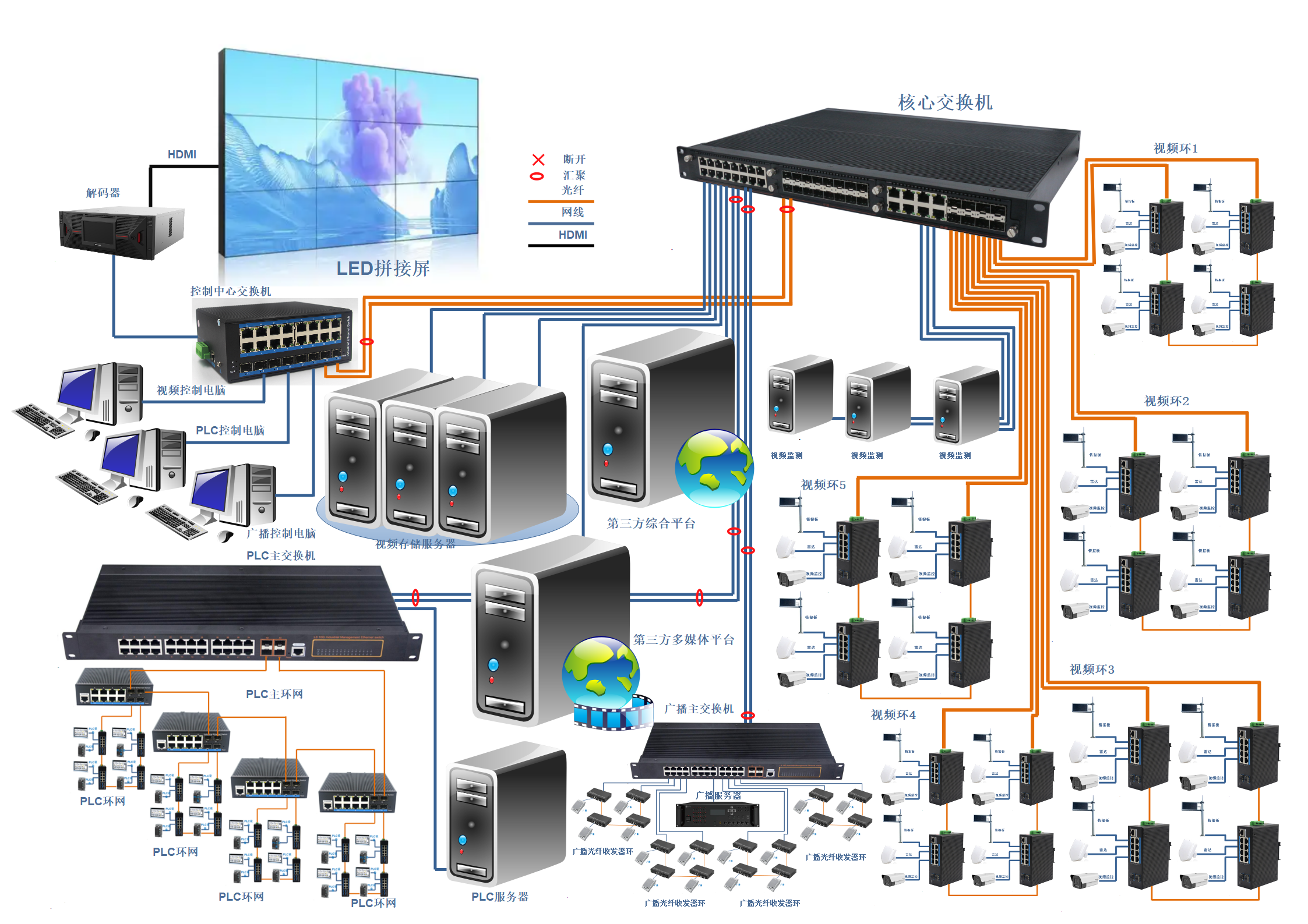 整個方案通過HDMI視頻傳輸、光纖通信和以太網相結合的方式,實現視頻監控、工業控制、廣播通信等多系統的統一接入和集中管理。